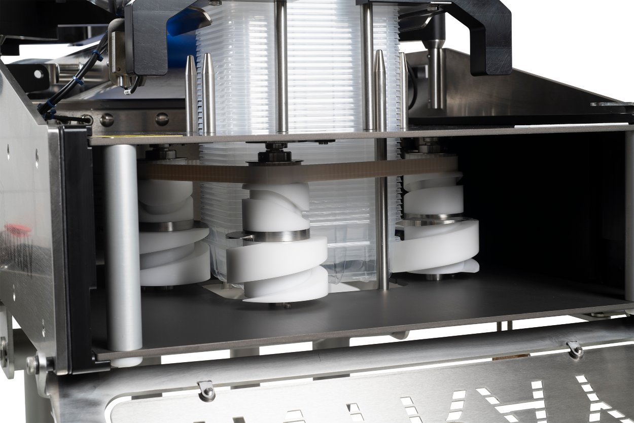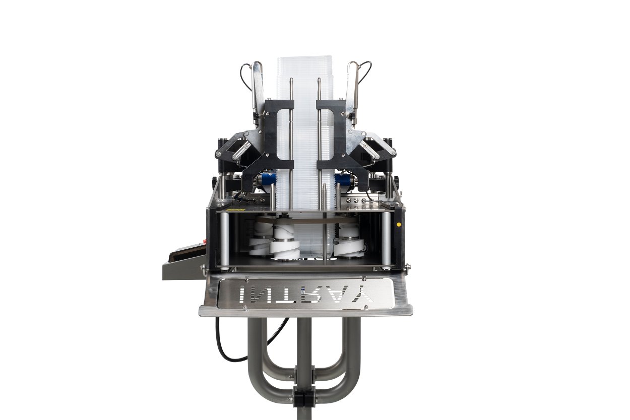 The INTRAY Buffer Servo is the ideal solution for a fast-moving production line or a line with little manpower available to replenish trays. The disc feeder is built into the Smart Stand, which saves a lot of space and provides autonomy and automatic loading of the new stack of discs into the denester. Buffer Servo comes with a custom Smart Tool.